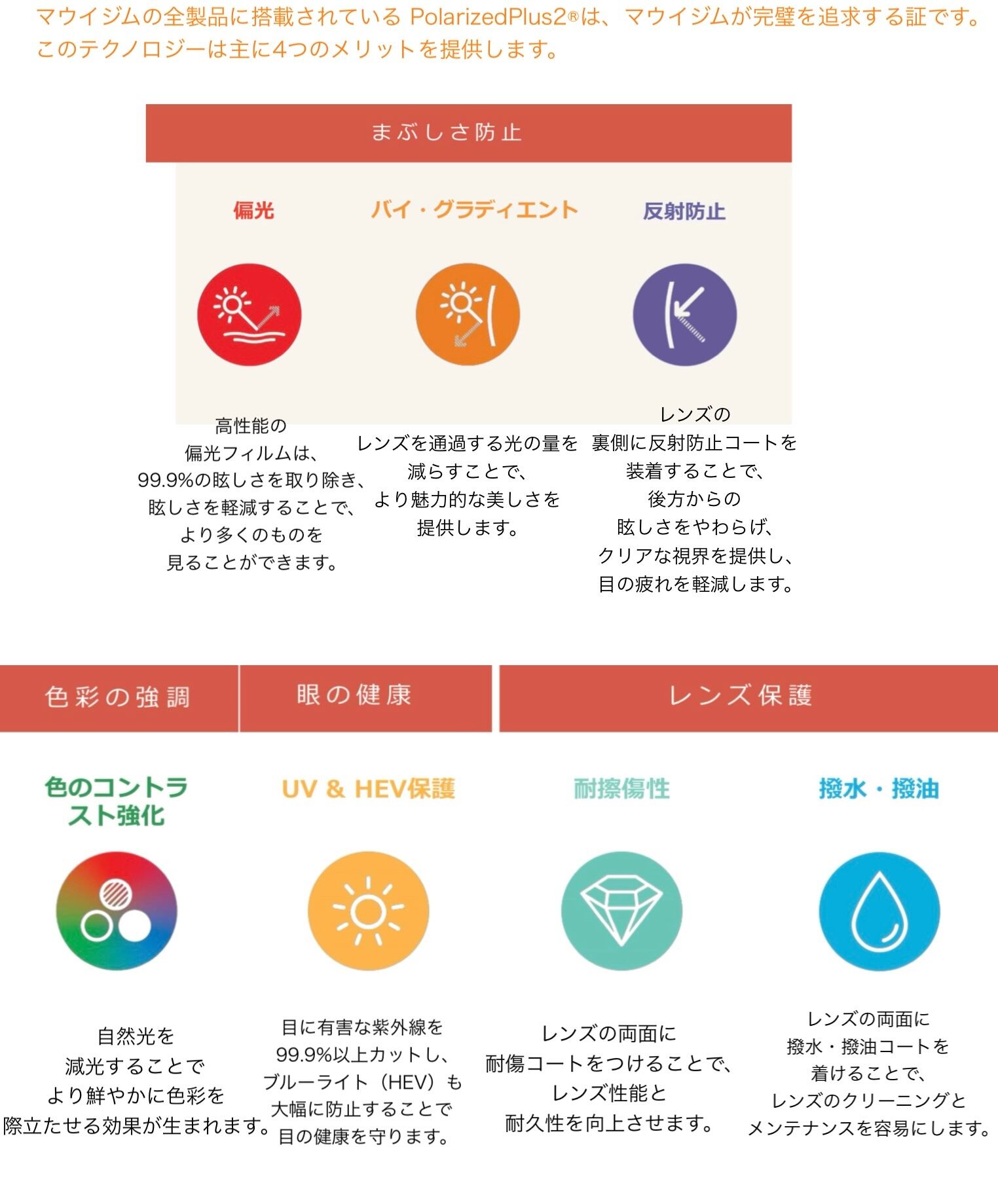 独自の「PolarizedPlus2®」偏光レンズ技術により、眩しい光をカットしながら、色彩を鮮やかに、コントラストをくっきりと見せます。これにより、目の疲れを軽減し、快適な視界を提供します。